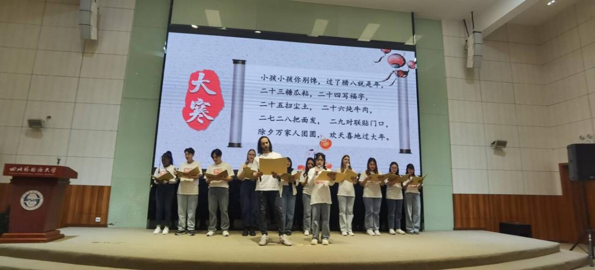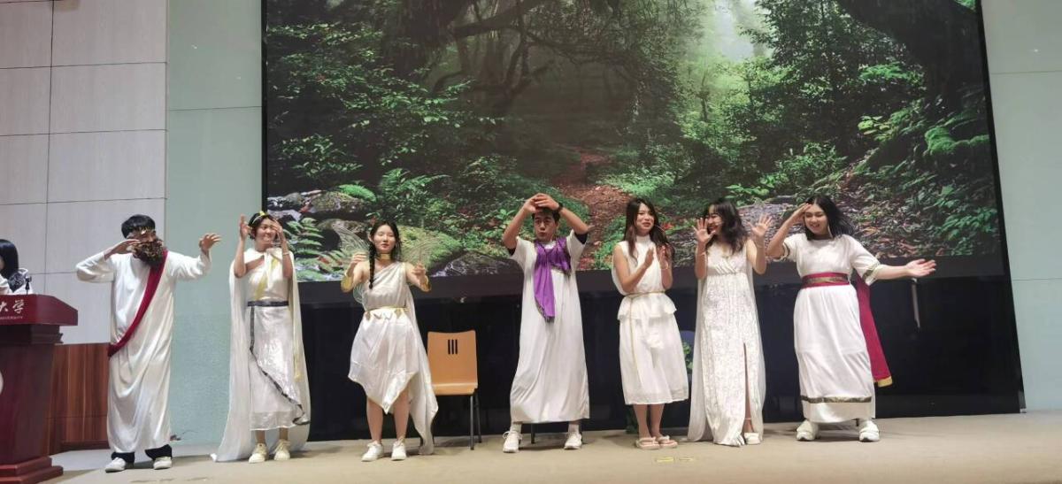 在才艺展示环节,中国学员和国际员工各显其能,通过舞台剧、大提琴演奏、诗朗诵、歌舞等丰富多样的表演形式,致敬中西文明互鉴——美美与共,总有和鸣。《仲夏夜之梦》重新演绎莎士比亚经典剧目,诗朗诵《古诗词中的中国节令——冬》将我们拉回传承千年的中国智慧;《铁道的秋日私语+三句半》描绘岁月静好的歌乐记忆,诗朗诵《和我们一样享受春天》发出维护世界和平安宁的热切呼唤……段俊晖教授的一曲吉他弹唱《There must be more to life than this》温暖了全场师生。因为好奇, 遇见世界。这个秋日的下午, 这份生动共享,为我们继续与世界同行,注入了崭新动力。