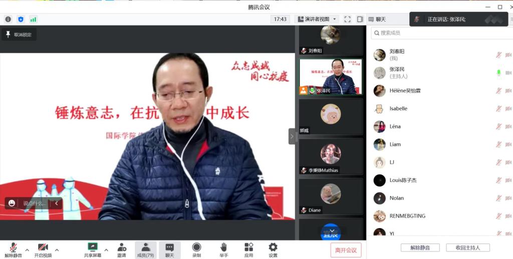 张泽民指出,疫情对同学们的自我管理提出了更大的挑战,是在疫情中得过且过,随波逐流,还是面对疫情,更加精细管理好自己,调整好心态,是每一位同学都应该思考的问题。张泽民寄语同学们,面对疫情,不抱怨,不埋怨,冷静理智对待困难;充分利用时间,内外兼修,以更加坚忍的意志,做到抗疫和学习两不误,在抗击疫情的过程中,成就自己,升华自己。