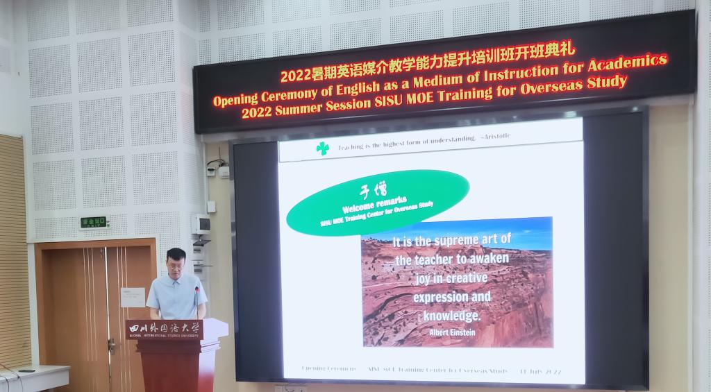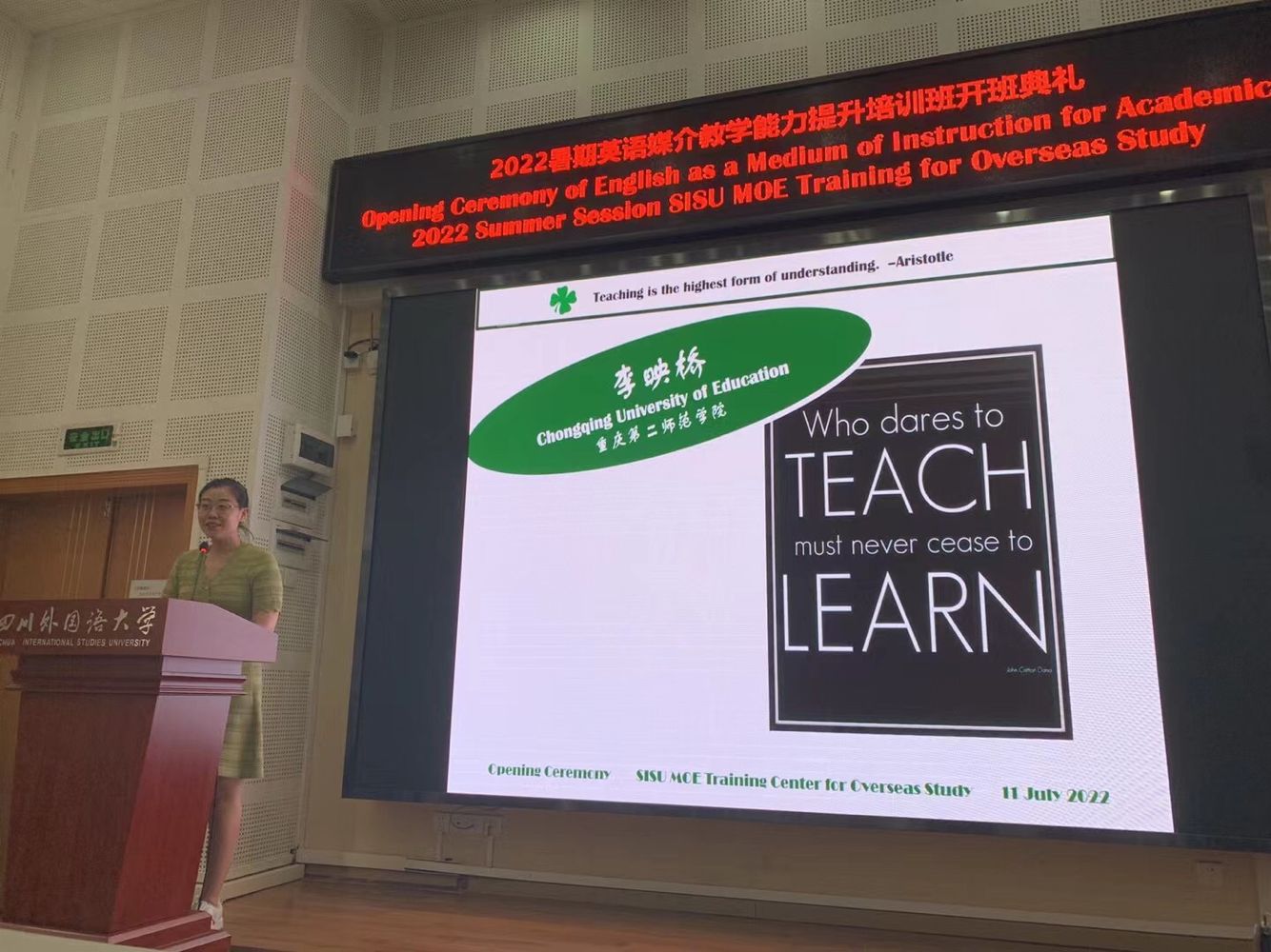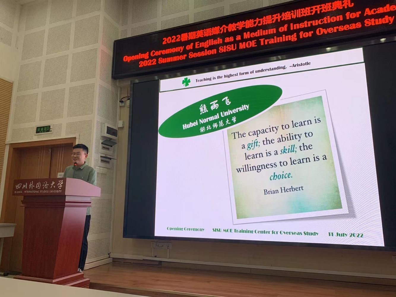 教师代表王星耀和于增表示,能与优秀的学员一起分享EMI教学经验,将是一份难得的体验,愿大家砥砺同行,共同登上更加开阔的教学平台。学员代表湖北师范大学的熊雨飞和重庆第二师范公司的李映桥表示,作为教师, 理应乐于学习、善于学习,不断追求教学卓越。段俊晖老师带给大家一曲优美的《传奇》中英文演唱, 语言与音乐之美让有些炎热的空间变得清新纯美,希望全体学员与跨文化交际的爱情故事也成为我们一生的传奇。