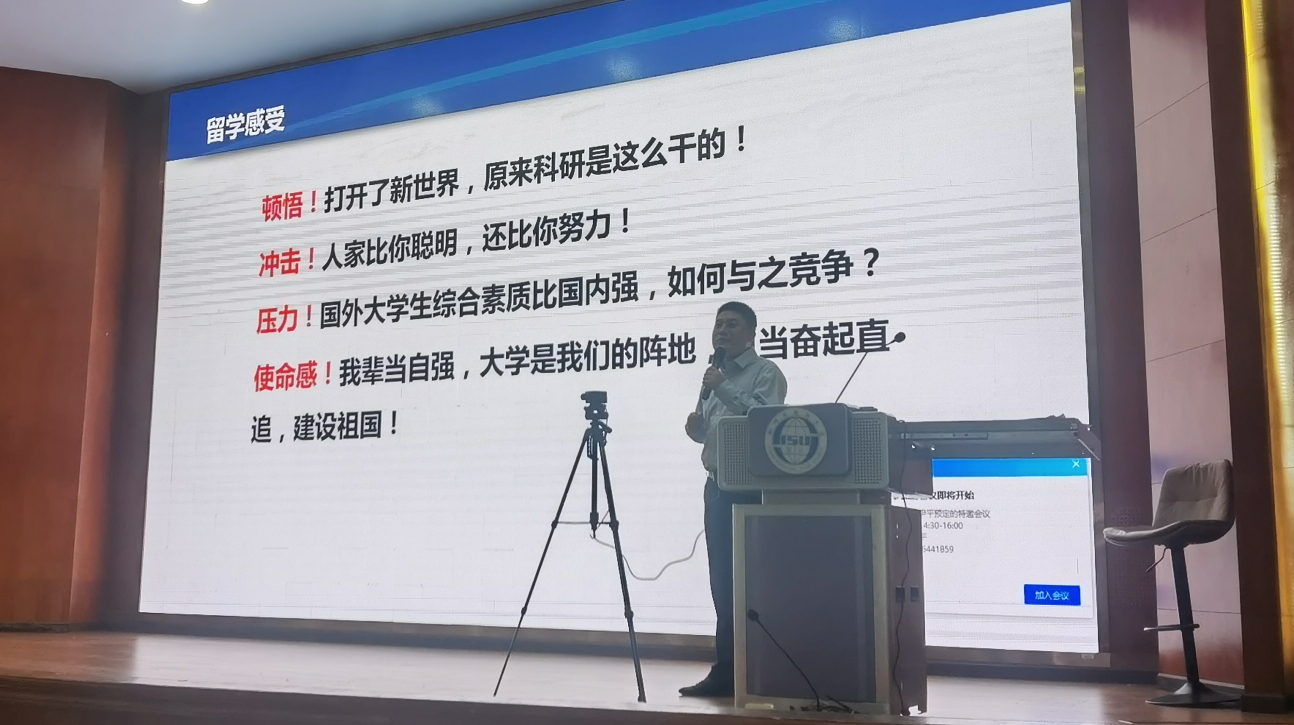 段俊晖教授阐释了“讲好美丽中国故事,提升国际传播能力”的源头、方式、关键和路径。从传统文化传承溯源,寻根中华民族的精神命脉;探索创新模式,开拓全球研究视野,凝练跨界创新思维;指出关键在于融汇中外的交流,做到尊重差异,因地制宜;构建国际化表达的传播路径,让国际受众听得到、听得清、听得进。徐琳教授分享了他在美国的留学经历,从行前准备到心态调整,再到游学计划,详细而生动地教大家如何融入当地社会,如何高效地利用当地资源优化学习成效,回国后积极进行教学和科研创新, 并取得突出成绩。徐琳老师鼓励大家不仅要有梦想,更要有能力,要与优秀的人同行,方能在国际舞台展现自信自强的中国学者风采,为祖国的繁荣与发展助力。法国职工罗曼结合自己的亲身经历讲述了他在异国如何克服跨文化交际障碍、融入本土文化;面对汉字的巨大挑战,如何提升汉语水平;在东西方文化的交流和碰撞中,如何解读“和而不同,美美与共”等思想。最后用风趣幽默的语言为留学人员在工作生活、语言学习、文化适应等方面提出了切实可行的建议