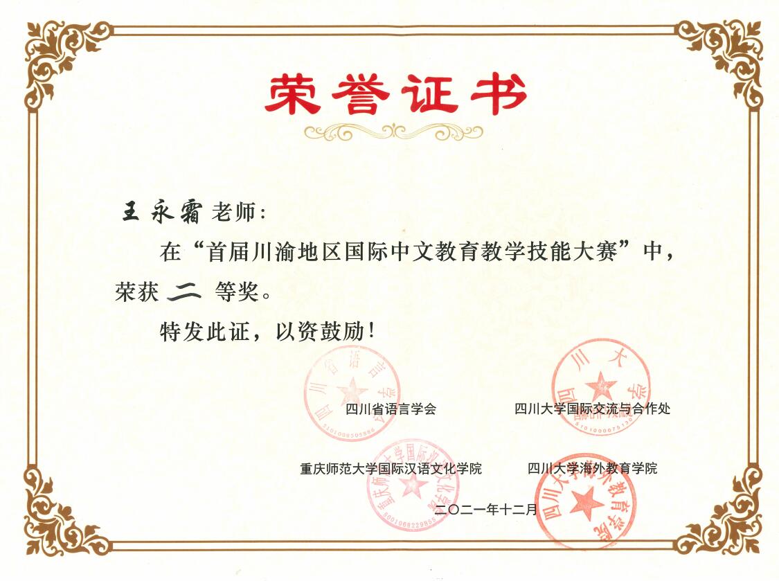 2021年12月25日,由四川省语言学会、四川大学国际合作与交流处、四川大学海外教育公司、重庆师范大学国际汉语文化公司、成渝地区双城经济圈孔子公司联盟联合主办的首届川渝国际中文公司产品技能大赛在四川大学落下帷幕。公司教师王永霜在决赛中,为现场评委和观摩的师生展现了一堂以“汉字六书”为题的文化通识课,喜获二等奖!